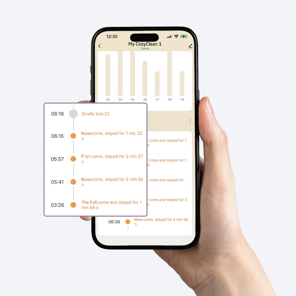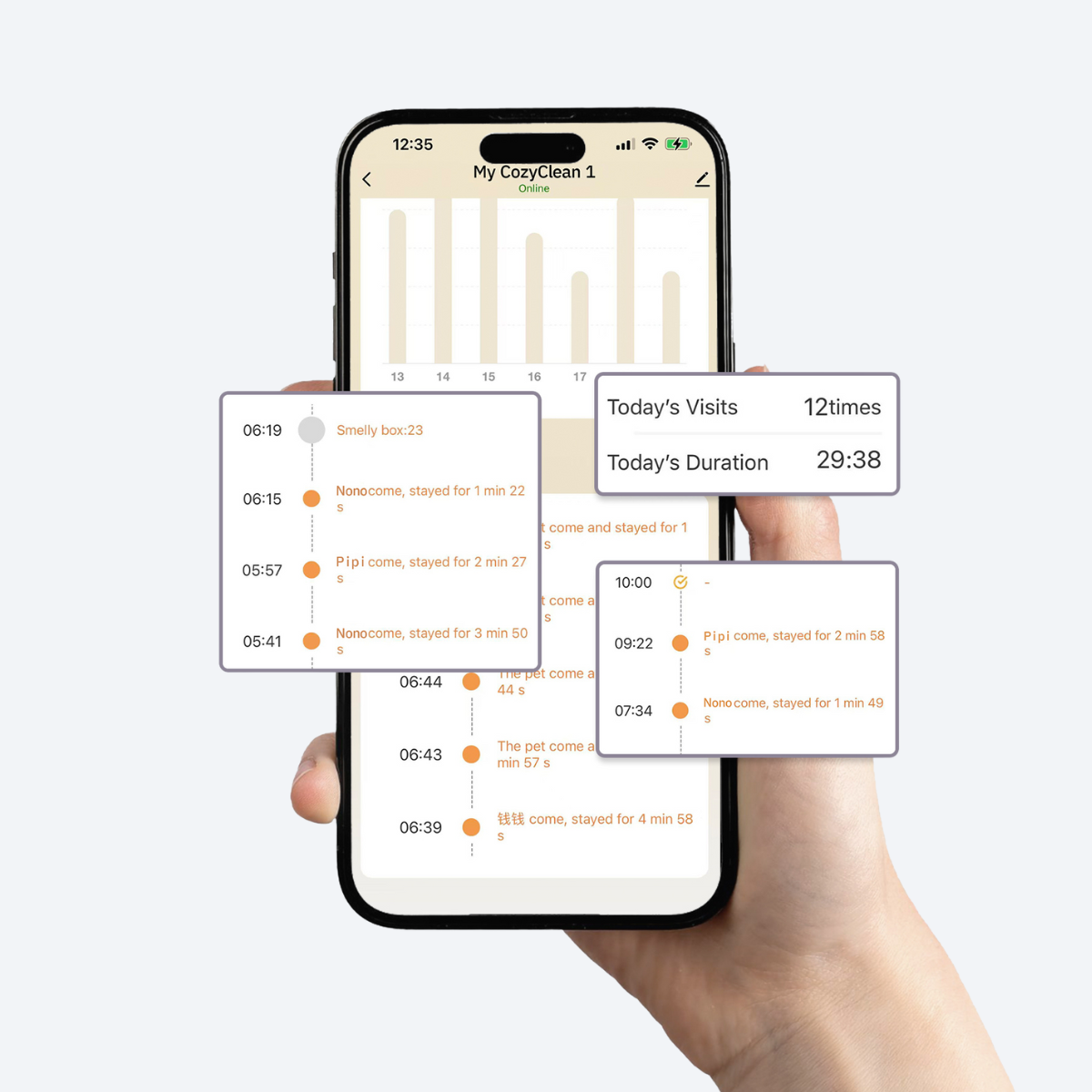 Erfasst, wann deine Katze das Gerät betritt und verlässt – sowie Aufenthaltsdauer und Häufigkeit der Toilettengänge.