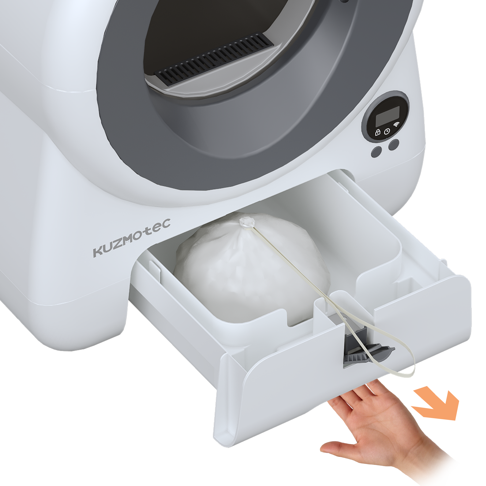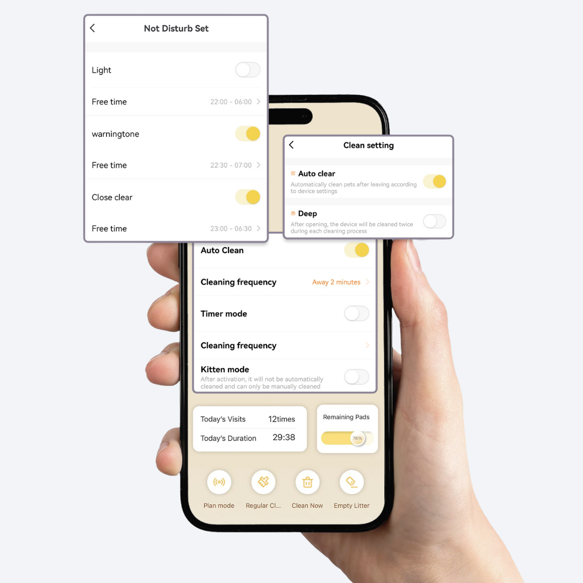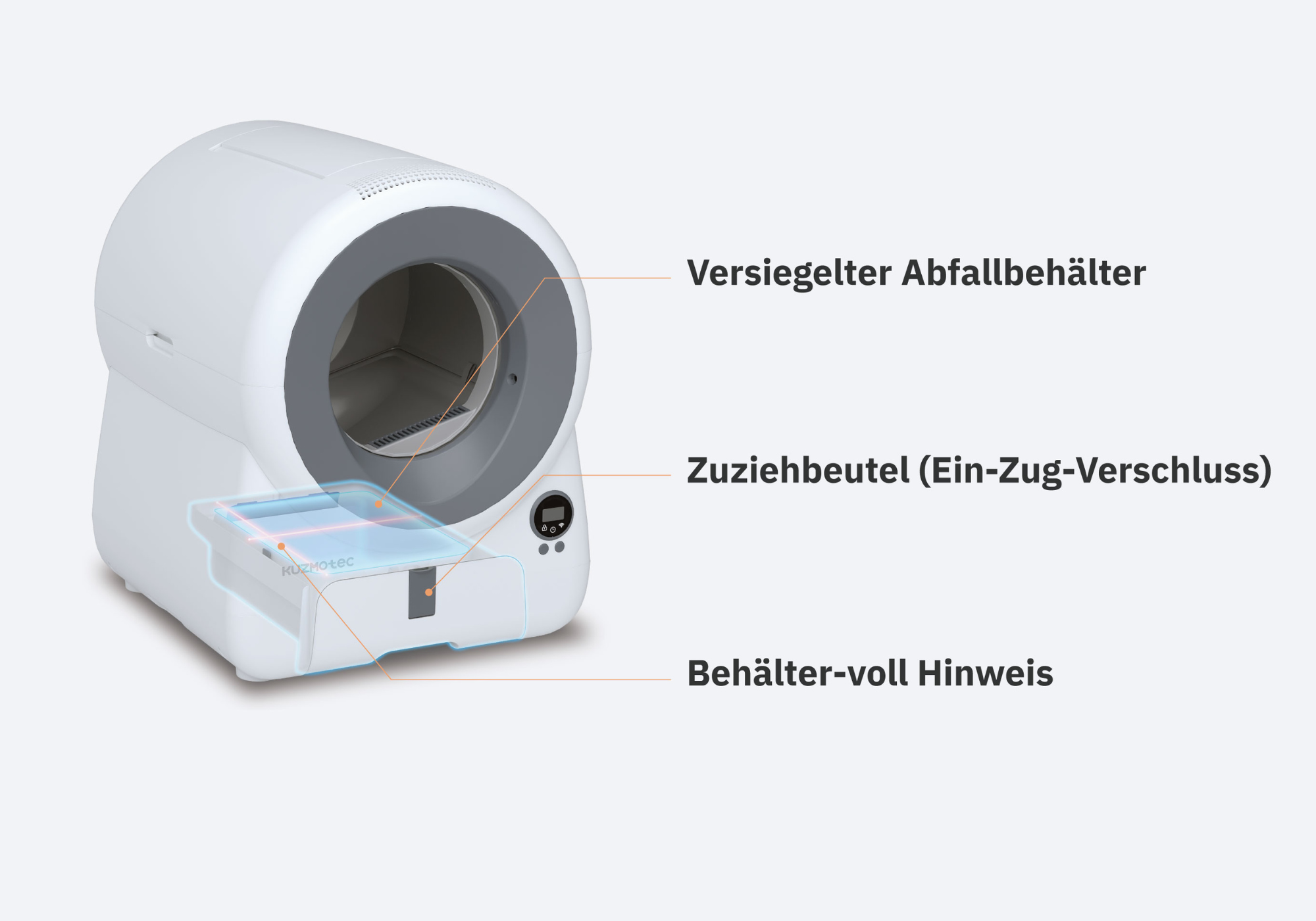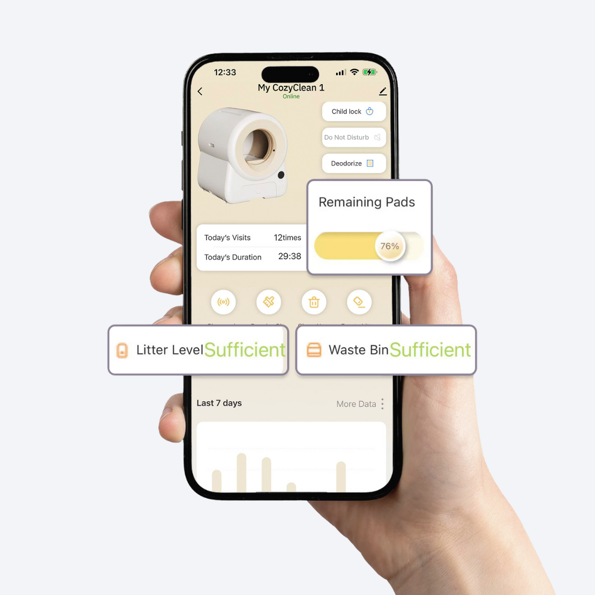 Aktualisiert in Echtzeit den Streu-Füllstand, den Stand des Aroma-Pads und den Status des Abfallbehälters.