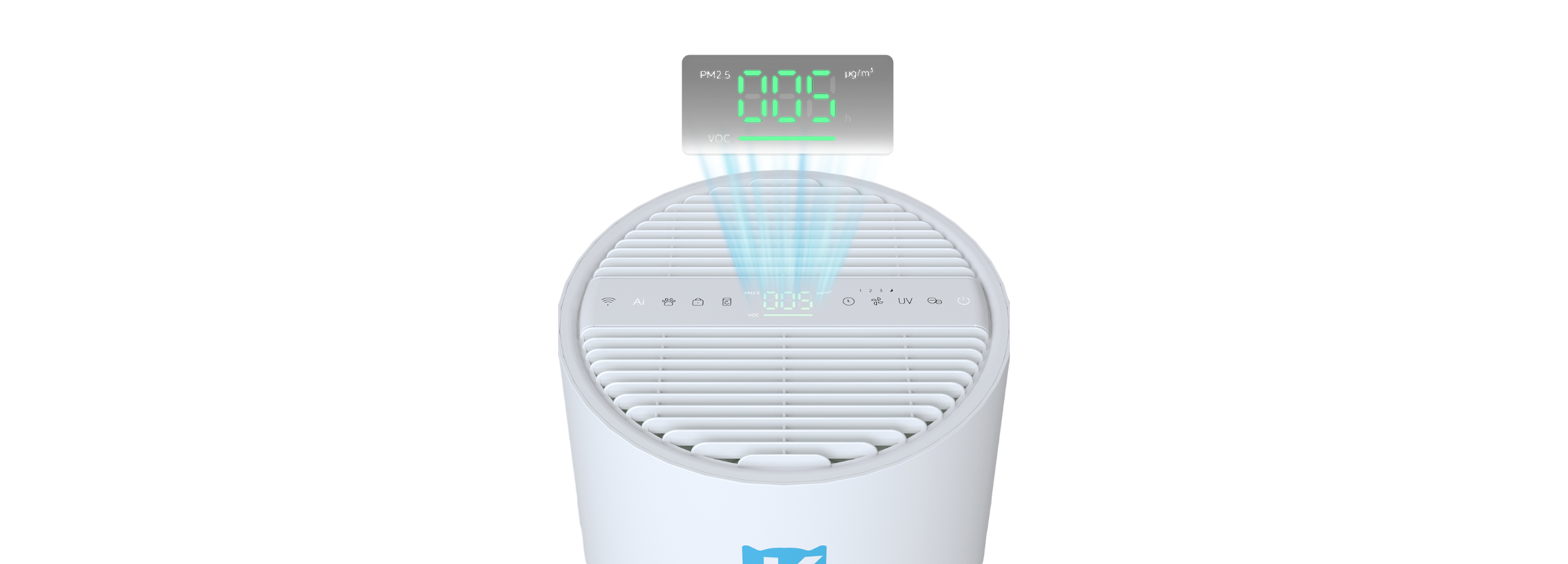 Obere Luftauslassöffnung – CADR bis zu 435 m³/h. Reinigt ca. 15 m² in etwa 6 Minuten. Die gereinigte Luft wird nach oben abgegeben – ohne Haustiere zu stören.
