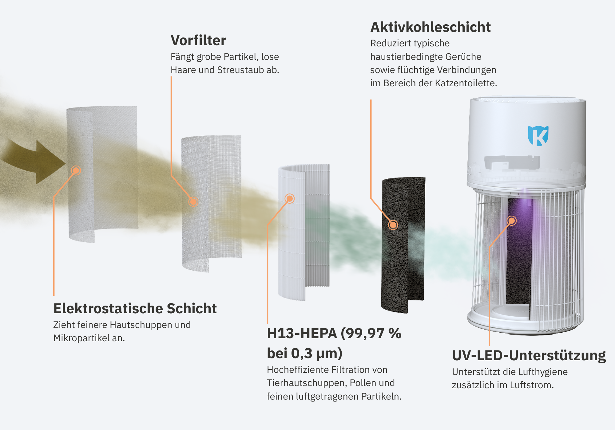 Von groben Partikeln bis hin zu feinen Hautschuppen und alltäglichen Gerüchen – Schicht für Schicht gefiltert.